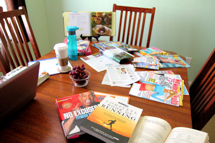 I have about a two year’s worth of Runner’s World subscriptions, some Women’s Health magazines, Prevention and Self Magazines, plus some exercise books, nutrition novels and cookbooks. I grabbed a spiral notebook and my Starbuck’s Skinny Vanilla Latte (not homemade today) and FILLED our dining room table. (It felt like I was back in high school, preparing for an AP exam or something!)