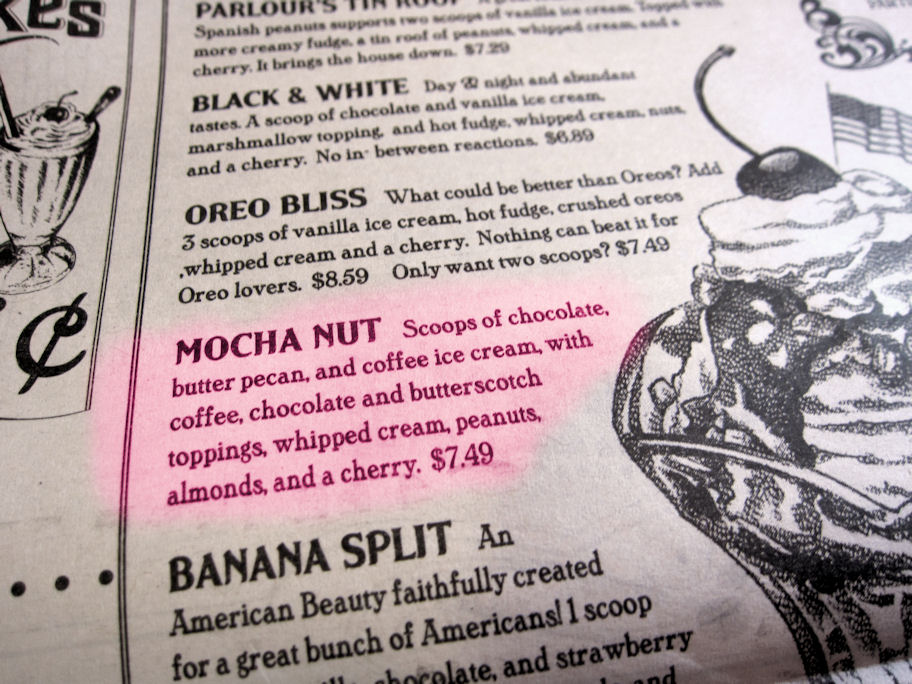 When I saw the title “Mocha Nut” I knew I wouldn’t find anything else more perfect for me. Coffee ice cream, Mocha Almond Fudge ice cream, and Butter Pecan ice cream. It’s like I designed it myself! Aside from the whip cream and cherry which I promptly plopped off, I finished the whole thing. Sadly this earned me no ribbon though..