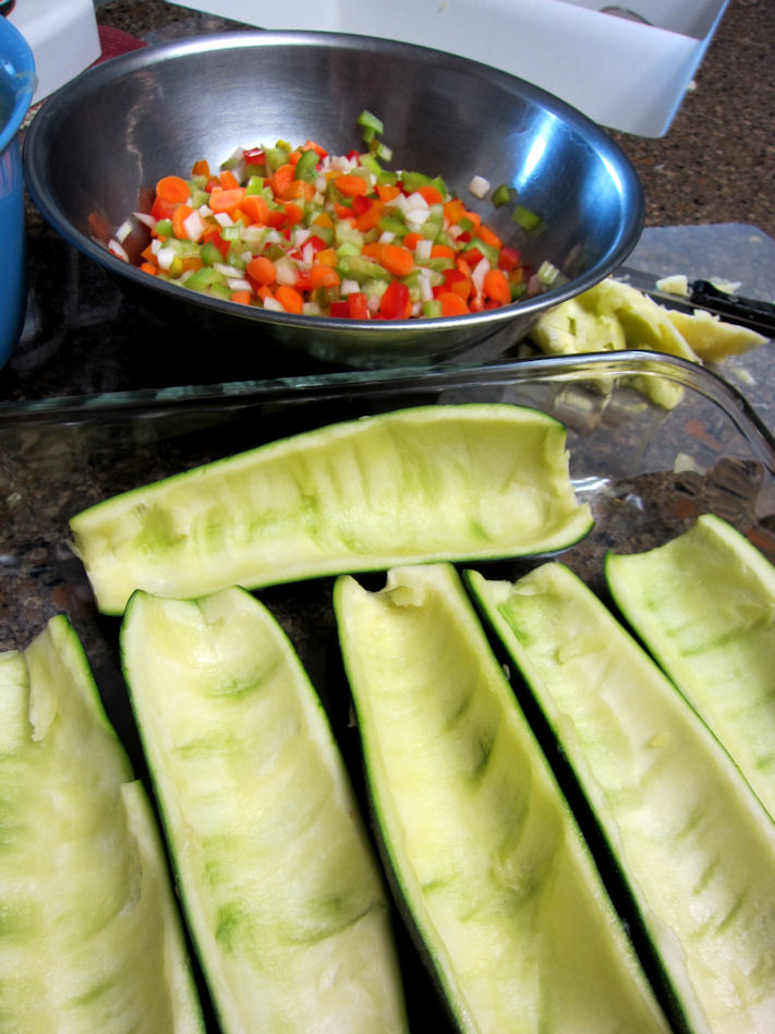 Mix all of the diced vegetables into the couscous once it is cooked; also add the zucchini that has been removed from the “shells” and combine. Then stuff the mixture in the zucchini boats and bake!